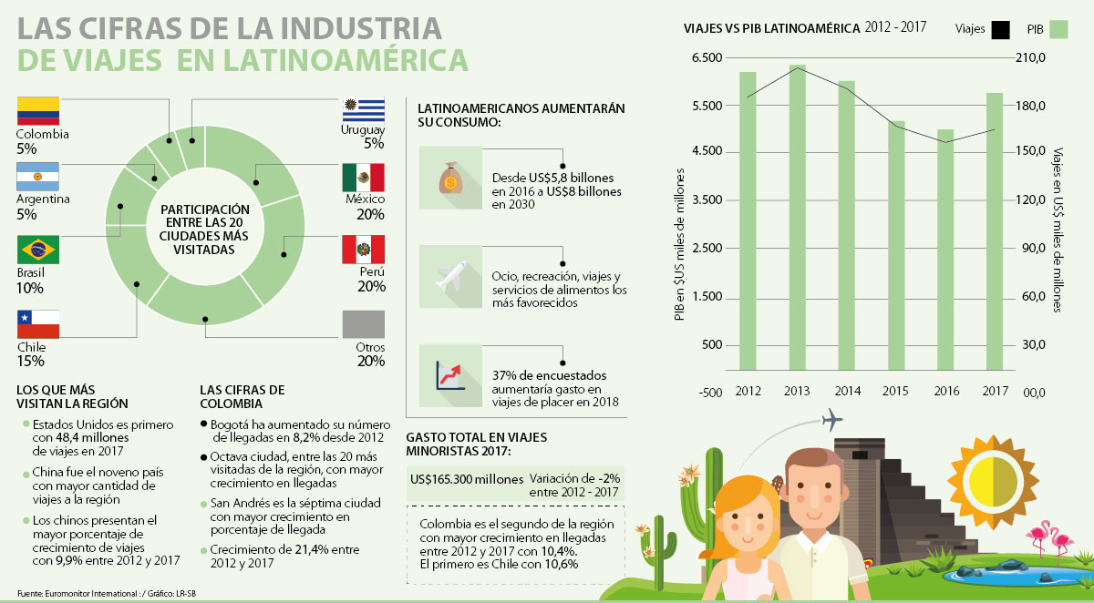 Un informe de la compañía consultora Euromonitor International revela que Chile y Colombia son los dos países latinoamericanos que más aumentaron el porcentaje de llegadas entrantes entre 2012 y 2017. El país austral logró aumentar su cifra 10,6%, mientras que Colombia incrementó su tasa en 10,4%. México y Brasil fueron los más visitados de la región el año pasado, con 36,7 millones y 6,4 millones de entradas respectivamente. Colombia por su parte llegó a 2,6 millones de ingresos, según la compañía, y Chile logró 5,6 millones.