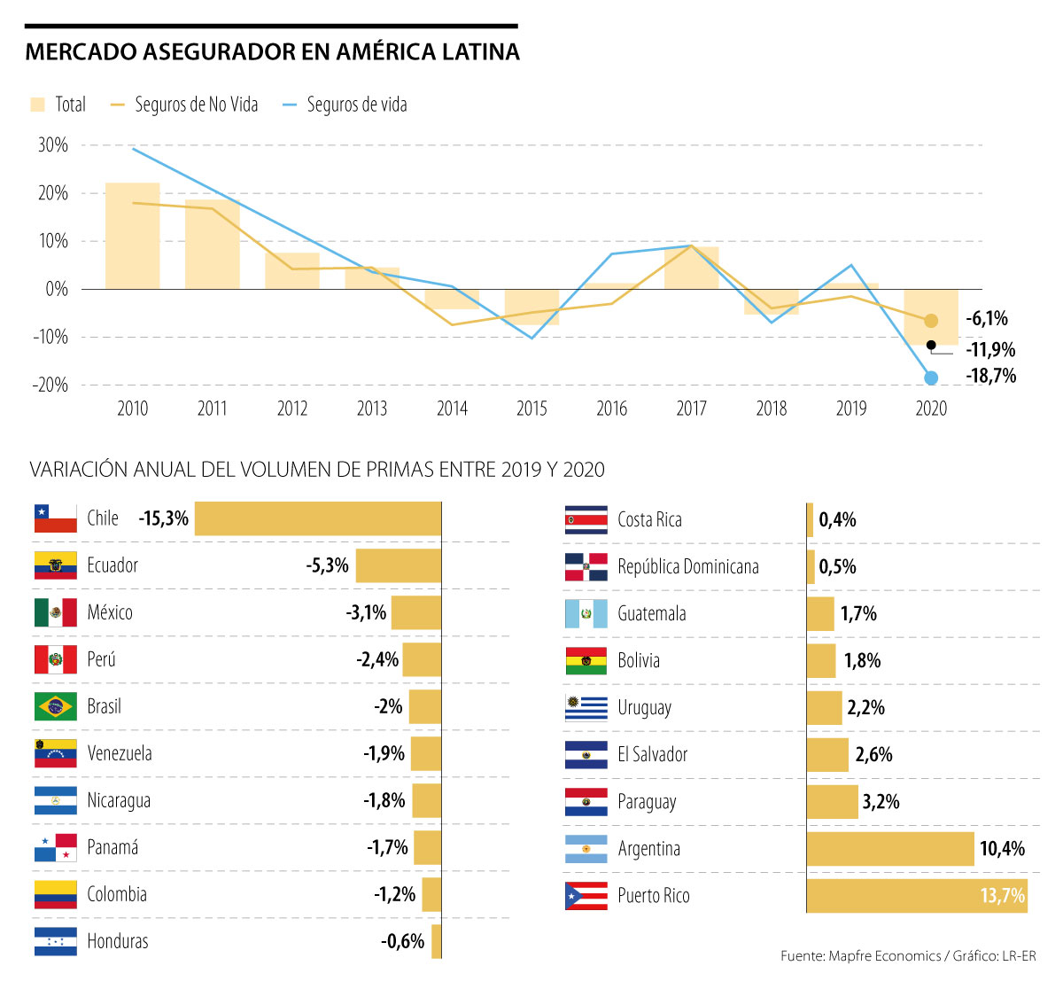 En contraste, en 2020 también hubo algunas excepciones como Puerto Rico, que registró un crecimiento de 13,7% hasta alcanzar los US$16.077 millones de primas, por el buen comportamiento de los seguros de salud, dice el informe.