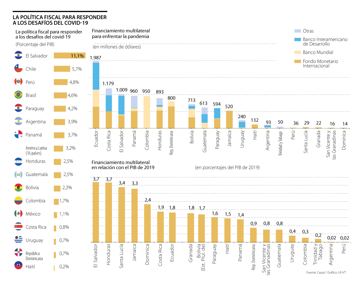 La avalancha de medidas anunciadas por los gobiernos de la región para mitigar el impacto de la crisis generada por el covid-19 en frentes como salud, economía, empleo, entre otros, ha puesto a El Salvador (11,1%), Chile (5,7%) y Perú (4,8%) como los países del vecindario donde se han anunciado esfuerzos fiscales como proporción al PIB por el covid-19, según la Comisión Económica para América Latina y el Caribe (Cepal).