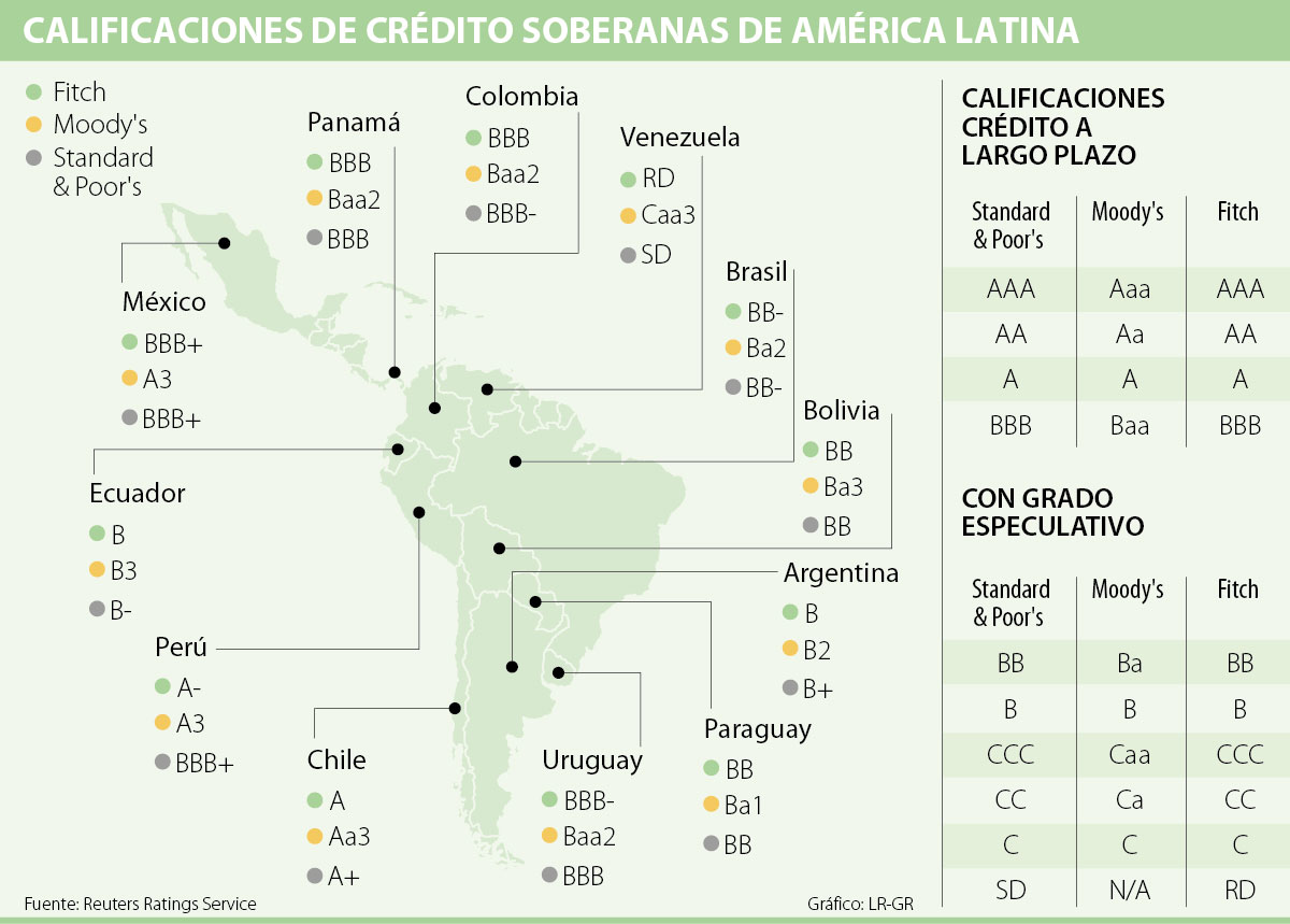 En la región solamente Chile, Colombia, México, Panamá, Perú y Uruguay están calificados por fuera del grado especulativo en su perfil crediticio por las tres agencias, algunos con advertencias. En Colombia, Moody’s cambió a negativa la perspectiva de calificaciones de riesgo crediticio ante una desaceleración de la consolidación fiscal y la posibilidad de que asuma la presidencia un gobierno débil.