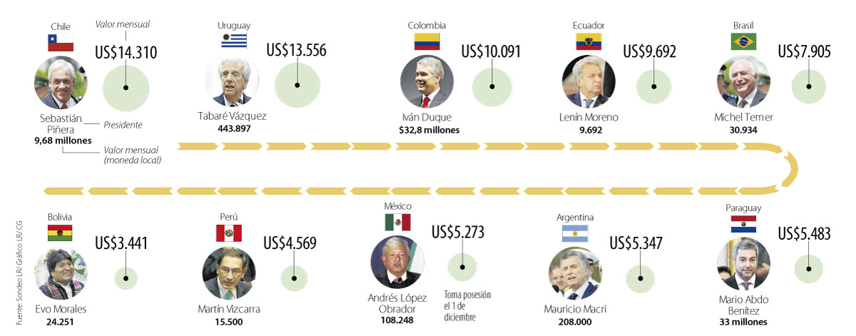 Manejar un país no es una tarea sencilla, razón por la que el trabajo de un presidente es uno de los mejor remunerados del mundo. En el caso de América del Sur, la mayoría de los presidentes tienen un sueldo mensual inferior a US$10.000, con excepción del chileno Sebastián Piñera, el uruguayo Tabare Vázquez y el colombiano Iván Duque, cuyos sueldos llegan a US$14.310, US$13.556 y US$10.091, respectivamente.