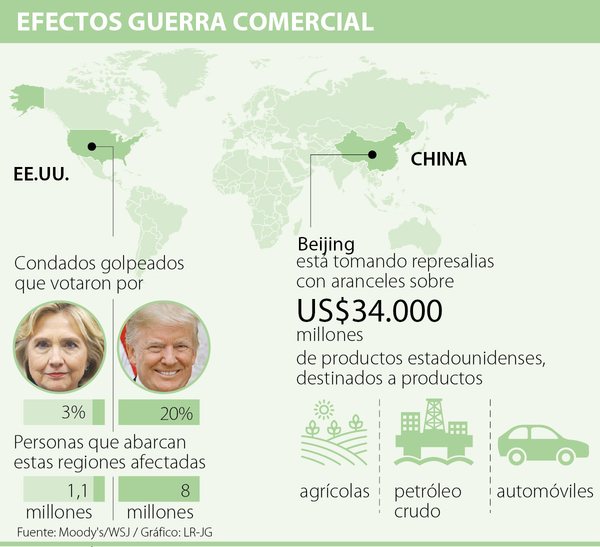 Según un análisis de Moody’s, los productos que seleccionó china provienen de 20% de los condados que votaron por Trump. Estas regiones, que abarcan a ocho millones de personas, verían afectado un 25% de su PIB.