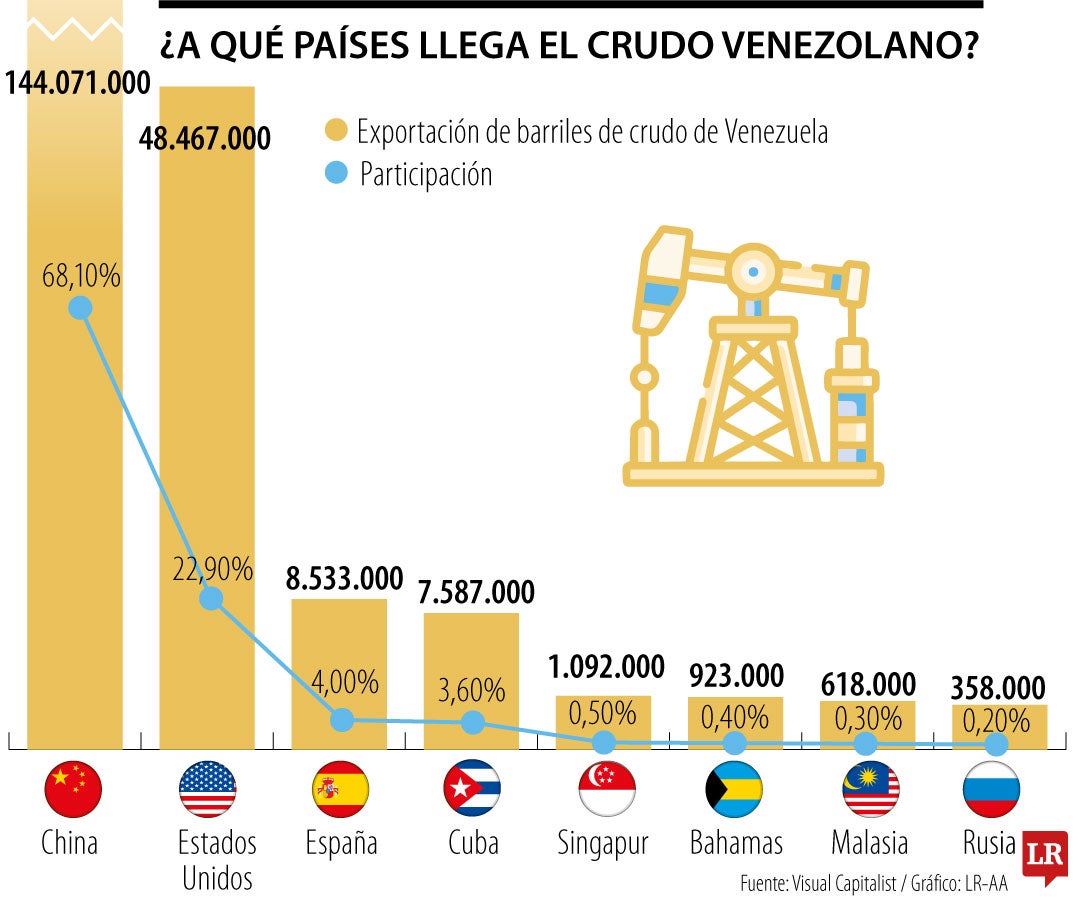 China fue el mayor destino de los hidrocarburos venezolanos, recibiendo alrededor de 144 millones de barriles, equivalente a 68,1%