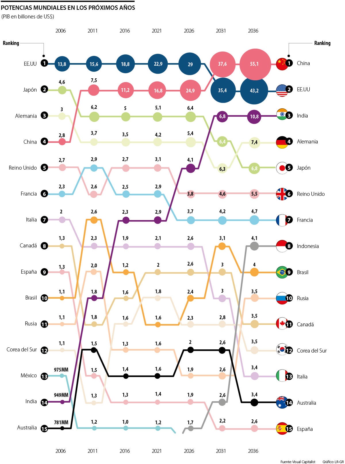 Otro hallazgo del estudio es el sorpresivo repunte de India hasta el tercer puesto de las principales potencias mundiales dentro de diez años. Visual Capitalis calcula que el PIB de Japón y Alemania, actualmente en el tercer y cuarto lugar del ranking mundial, es de US$5,1 billones y US$4,2 billones, mientras que el de India es de US$2,9 billones.