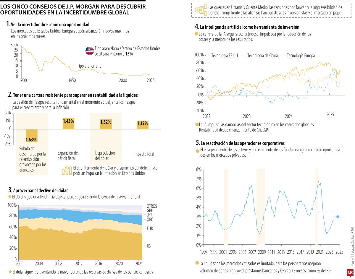 Estos cinco consejos se basan en ver la incertidumbre como una oportunidad, tener una cartera resistente para superar en rentabilidad a la liquidez, aprovechar el declive del dólar, usar la inteligencia artificial como herramienta de inversión y la reactivación de las operaciones corporativas. El informe arroja ideas para que los inversionistas puedan adaptarse.