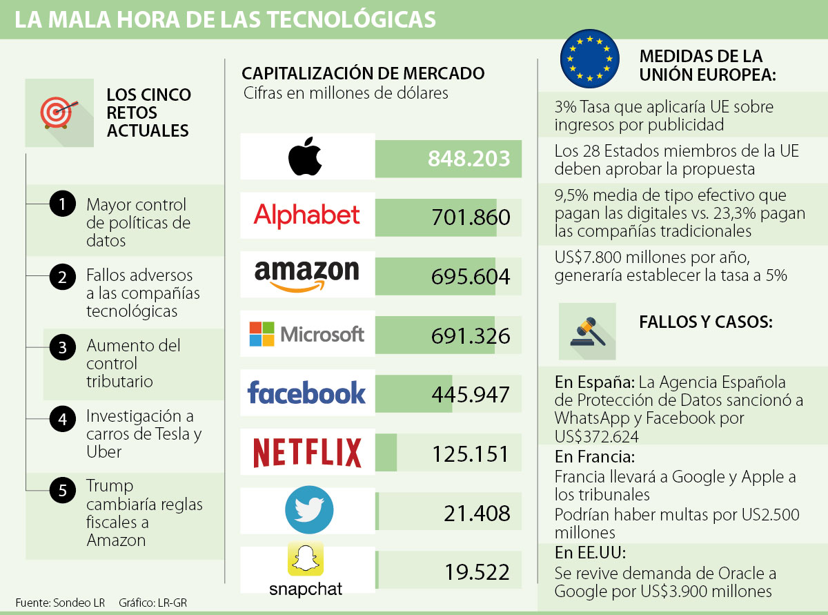Desde enfrentar la posibilidad de un mayor control tributario y nuevas regulaciones sobre uso de datos, hasta investigaciones por accidentes mortales e interferencia en asuntos electorales; las compañías tecnológicas enfrentan obstáculos en la tendencia al alza que han mostrado en las bolsas.