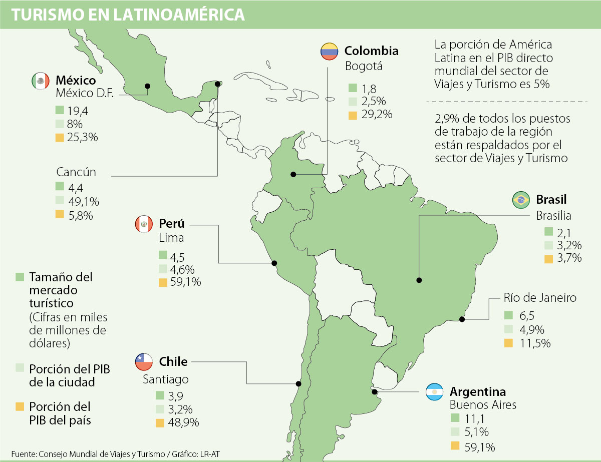 La segunda ciudad con mayor aporte del turismo a su PIB es Ciudad de México, con 8%, y la tercera es Buenos Aires, con 5,1%. Por el contrario, las ciudades cuyo PIB reciben menor porcentaje de este sector son Santiago (3,2%), Brasilia (3,2%) y Bogotá (2,5%).