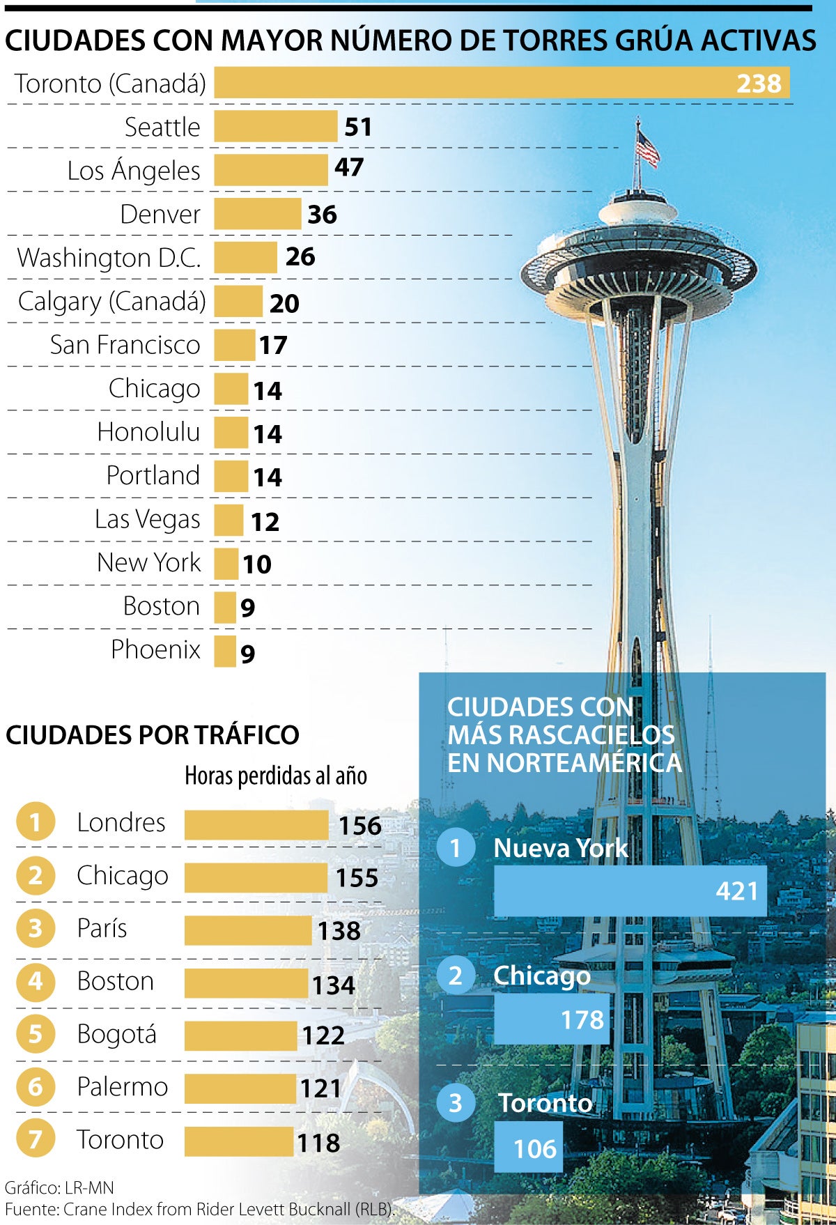 La ciudad más importante de Canadá está en obra. Según el último estudio realizado por la firma Rider Levett Bucknall (RLB), Toronto tiene más grúas torre de construcción activas que Nueva York, Boston, Los Ángeles, Seattle, San Francisco y Washington juntas. De hecho, mientras en todo Estados Unidos hay 259 aparatos de este tipo en operación, en la capital de Ontario hay 238.