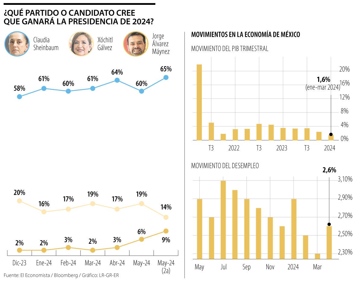 La tendencia electoral indica que Claudia Sheinbaum ganará la presidencia de México con 56,9% de los votos, aventajando por 25,7 puntos a Xóchitl Gálvez (31,2%), su contendiente del PAN, PRI y PRD; el tercer lugar será para el emecista Jorge Álvarez Máynez (11,9%). Esto, según encuestas de la última semana. (La Ley mexicana no permite generar nuevas encuestas ocho días antes de las contiendas)