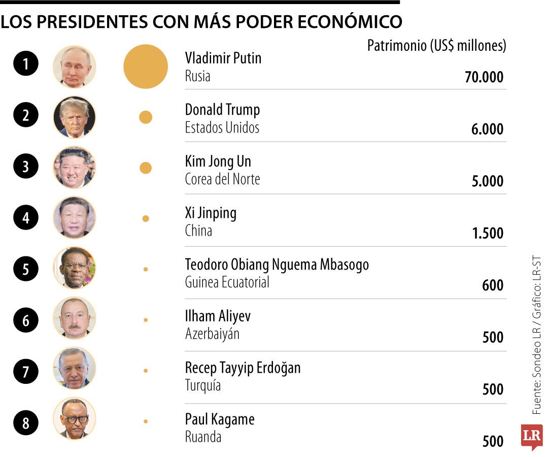 Vladimir Putin tiene una alta incidencia económica al ser el presidente más rico del mundo, pues alcanza un patrimonio de hasta US$70.000 millones, cifra que se aleja de las de otros líderes poderosos. Trump tiene mucho menos dinero: las cifras indican hasta US$6.000 millones de fortuna. El norcoreano Kim Jong Un sigue de tercero en el listado con un patrimonio cercano a US$5.000 millones según Celebrity Net Worth.