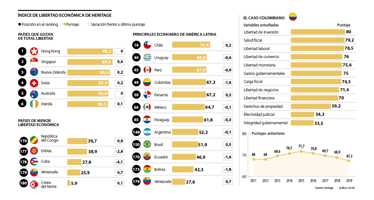 El Estado de Derecho, el tamaño del gobierno, la eficiencia normativa y los mercados abiertos son los cuatro aspectos con los que The Heritage Foundation genera anualmente su Índice de libertad económica, el cual, para la medición de este año, ubicó a Colombia en el puesto 49, lo que representó un descenso de siete puestos frente al año anterior.