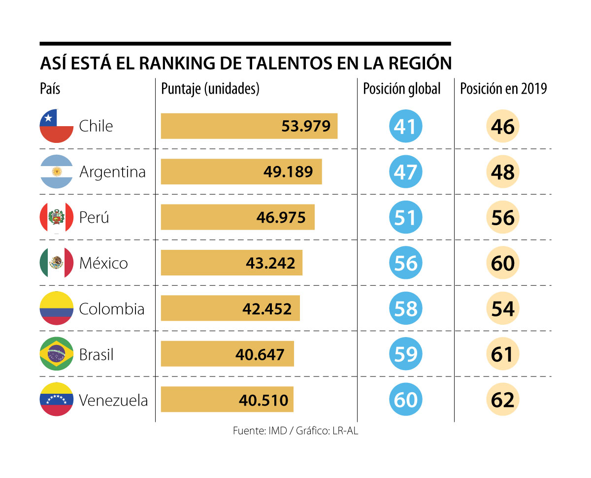 En materia regional, el país mejor ubicado fue Chile, que se posicionó en la casilla 41 y subió cinco posiciones frente a 2019. Le siguió Argentina en la casilla 47, Perú en la 51, México en la 56, Colombia en la 58, Brasil en la 59 y Venezuela en la 60. Curiosamente, Colombia fue el único país de la región que cayó en el ranking, mientras que el resto de economías analizadas mejoraron frente a 2019. Las que más avanzaron fueron Chile y Perú, subiendo cinco casillas cada una.