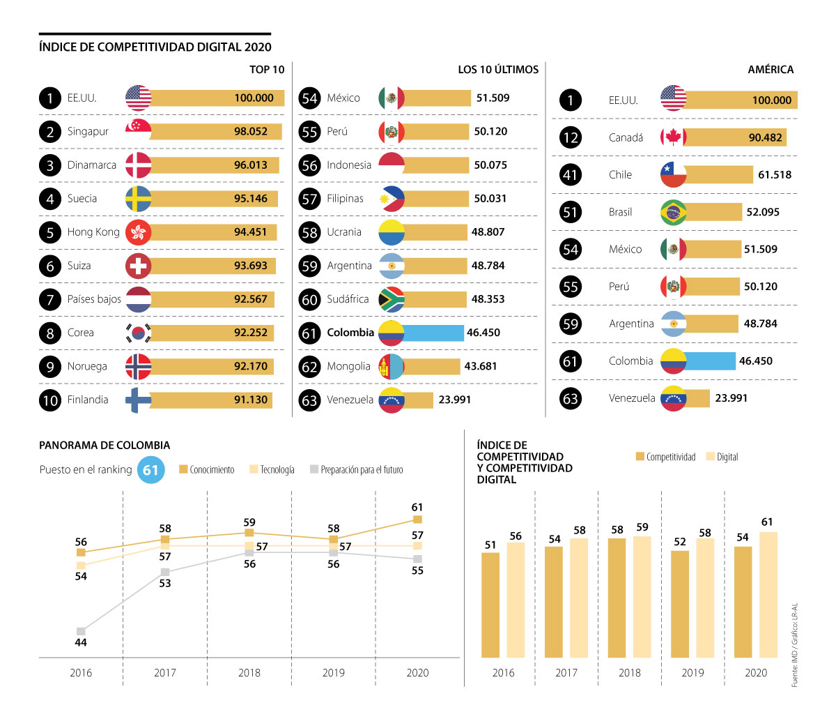 IMD examinó los avances de 63 economías en materia de competitividad digital y evaluó: tecnología, conocimiento y preparación para el futuro; frente a esto Chile, Brasil y Perú avanzaron en la posición general quedando en los puestos 41, 51 y 55 respectivamente; mientras que Colombia y México se ubicaron en los puestos 61 y 54 luego de caer tres y cinco puestos.
