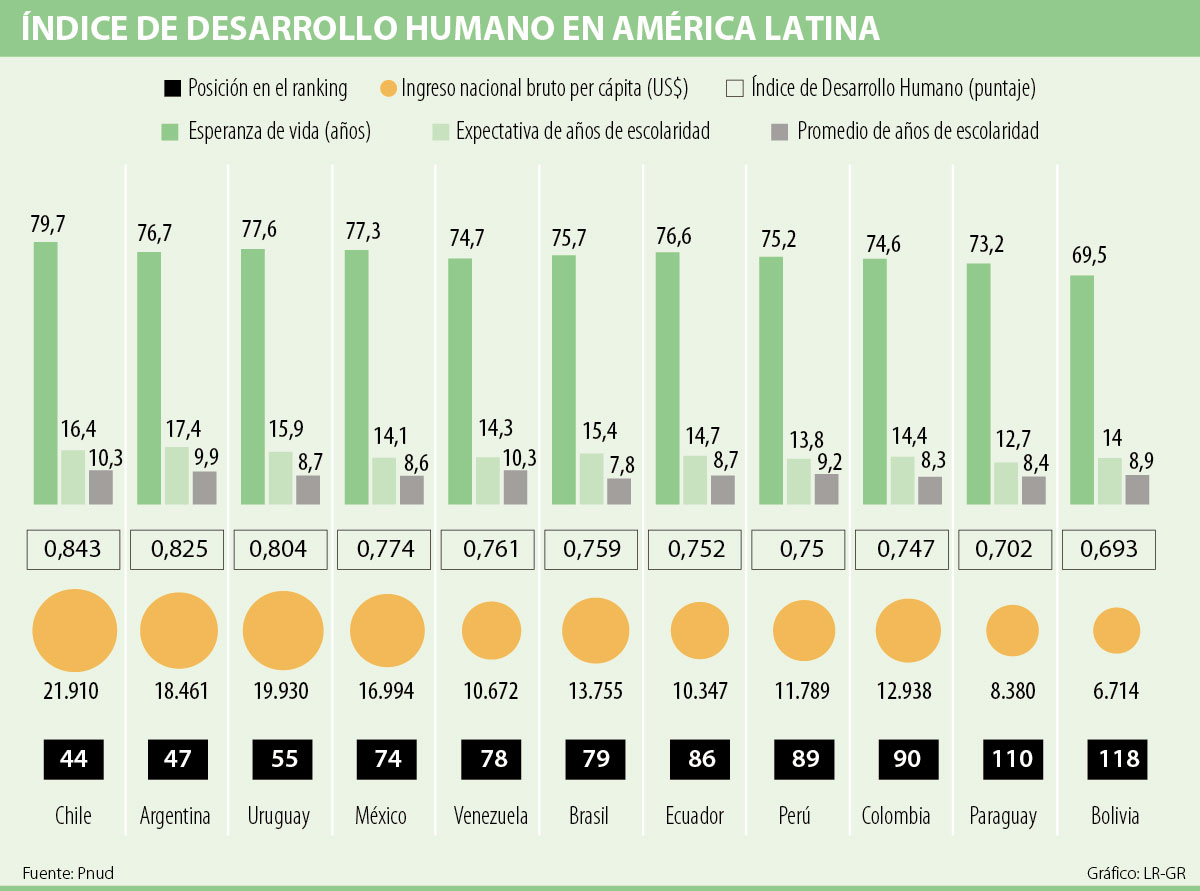 Chile lideró el grupo de naciones de Sudamérica y México, pues fue el país que mejor ubicación tuvo al quedarse en la casilla 44 del escalafón general del IDH. A su vez, punteó dentro de la región en aspectos como los ingresos brutos per cápita con US$21.910 y en el puntaje del escalafón general, que fue de 0,843.