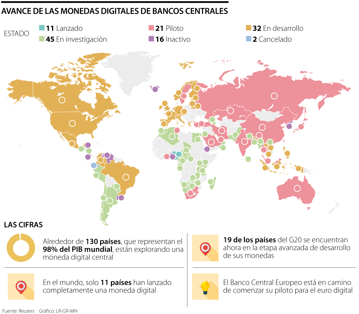 En la carrera de los países del mundo por emitir una moneda digital, a través de los bancos centrales, Atlantic Council reporta que, hasta el momento, hay 11 que ya tienen funcionando legalmente el activo digital, 21 están en pruebas pilotos, 33 ya tiene proyectos en desarrollo, 46 están evaluándolo, y hay una lista de 16 que están fuera del juego, pues no han iniciado aún ningún proyecto. Esto se traduce en que un total de 130 países, que representan 98% de la economía mundial, están estudiando versiones digitales de sus monedas, y casi la mitad de ellos se encuentran en fases avanzadas de desarrollo, piloto o lanzamiento.