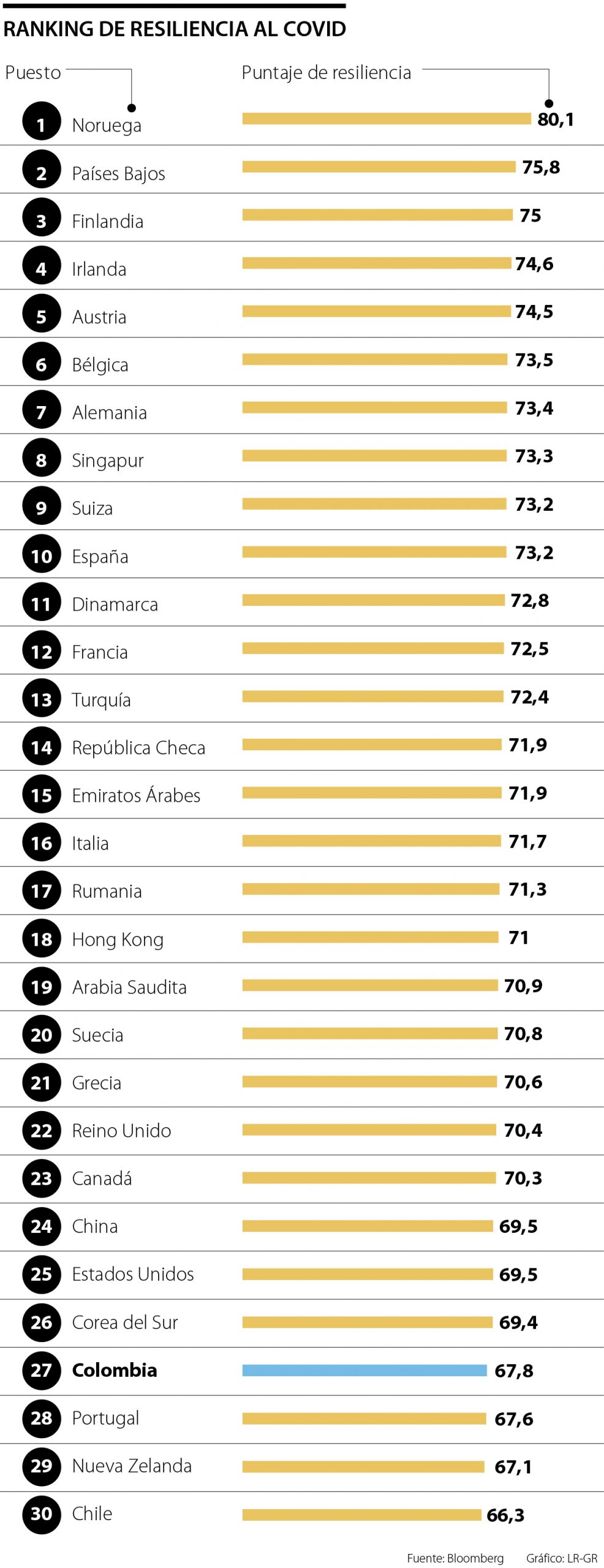 Así, de acuerdo con el índice de resiliencia ante el covid-19 de Bloomberg, Colombia es el país número 27 más resiliente del mundo ante la crisis desatada aún más con la variable delta.