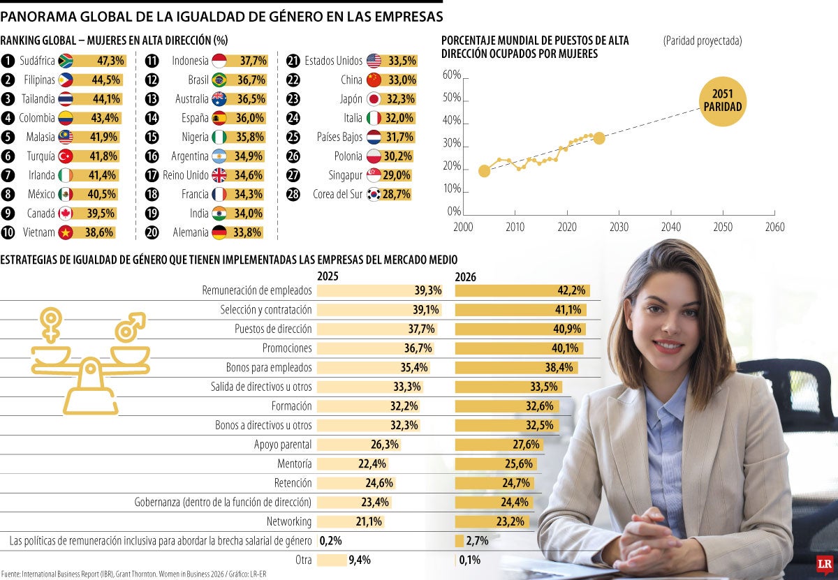 Un estudio de Mujeres en los Negocios 2026 elaborado por Grant Thornton ubica al país solo por detrás de Sudáfrica, Filipinas y Tailandia en liderazgo femenino empresarial