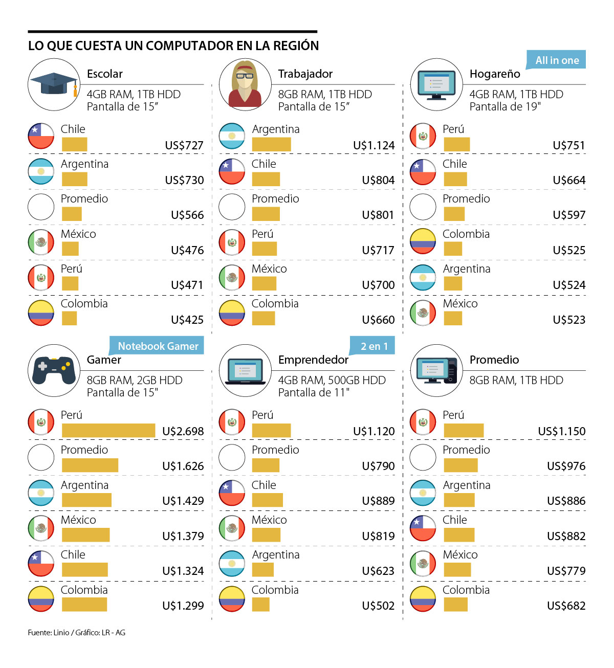 La firma de comercio electrónico Linio hizo recientemente un estudio en el que comparó los precios de seis diferentes tipos de computadores en cinco territorios de la región.