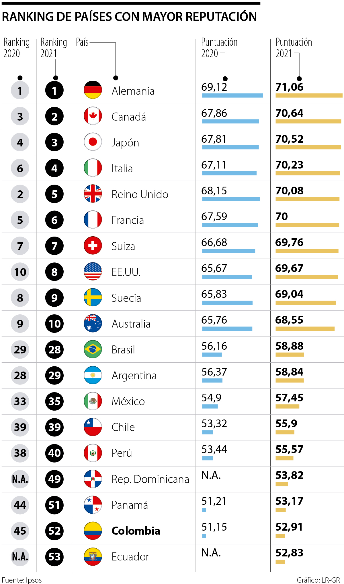 El resto de países de la región clasificados son: Argentina, en el puesto 29; México, en el 35; Chile ocupó el 39; Perú, el 40; República Dominicana estuvo en el puesto 49 y Panamá, el 51. En cuanto a los primeros lugares, Alemania ocupó el primero por séptima vez y por quinto año consecutivo. Fue la nación con mejor clasificación en el índice de Ipsos en 2008, 2014, 2017, 2018, 2019, 2020 y 2021.