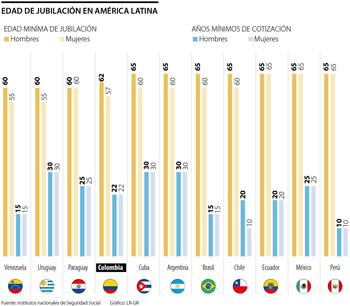 El Gobierno Nacional no ha descartado que una de las propuestas que se puedan incluir en el nuevo proyecto de reforma pensiones que se presentará en marzo sea incrementar la edad de jubilación; así lo señaló el ministro de Hacienda, José Antonio Ocampo, en una entrevista con El País de Cali. Actualmente, la edad de jubilación en Colombia es de 57 años para las mujeres y de 62 años para los hombres, situándose en el cuarto puesto de América Latina con la menor edad para jubilarse, antecedido por Venezuela, con edades desde los 55 y 60 años;Uruguay con 60 y 65 años; y Paraguay, donde ambos géneros pueden dejar de trabajar desde los 60 años.