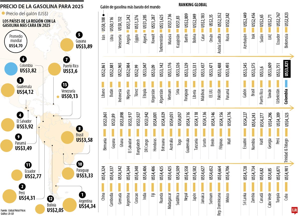 Con esta alza, el país se reacomodó en el ranking de los países con el precio de la gasolina más costosa por galón para 2025. En el mundo, se ubicó en la posición 126, mientras que, en la región, quedó de sexta.