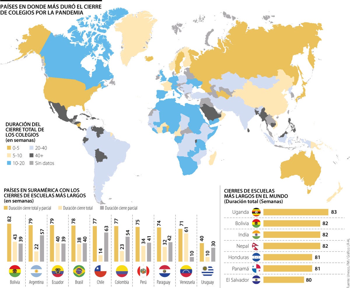 Fue seguida por Argentina, con 79 semanas sin clases presenciales; Ecuador, con 79 semanas en total, y Brasil, con 78.