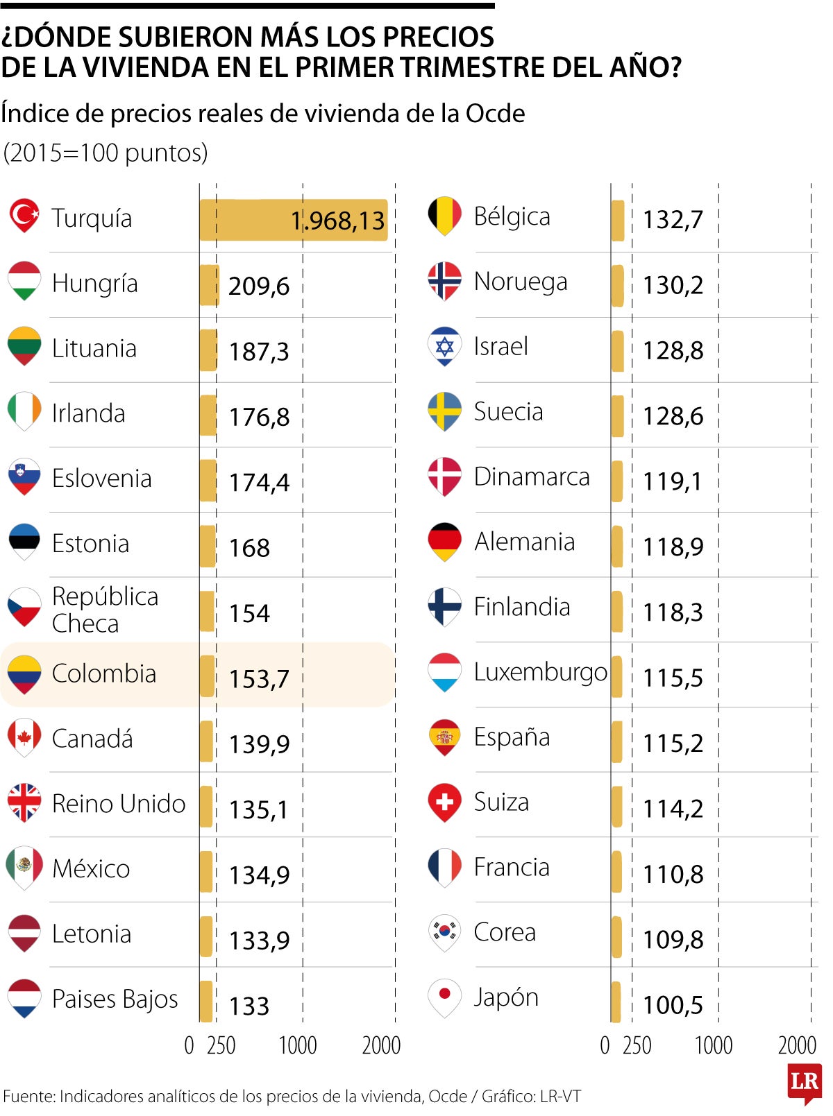De acuerdo con los últimos reportes del índice de precios de la vivienda de la Organización para la Cooperación y el Desarrollo Económicos, Ocde, en los tres primeros meses del año Colombia fue el octavo país donde más subieron los precios del alquiler de vivienda entre los miembros de la Ocde y ocupó el primer lugar a nivel regional, por encima de México. Además, el índice, que toma como base los precios promedio del arriendo desde 2015, mostró que en el país el alquiler ha aumentado más de 50% y es casi seis veces más caro que hace 10 años.
