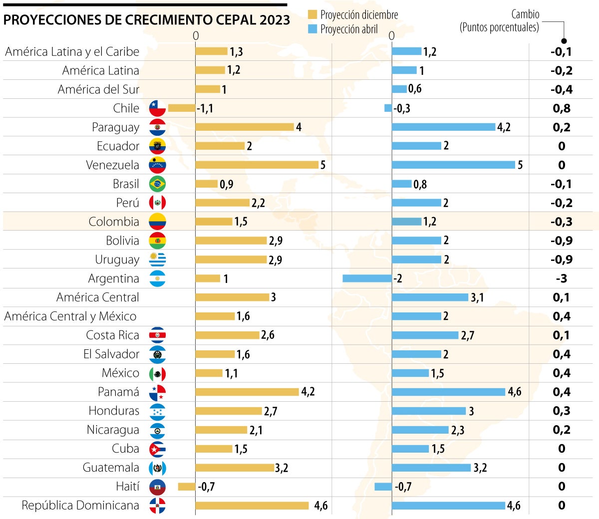 La Comisión Económica para América Latina y el Caribe (Cepal) actualizó sus proyecciones de crecimiento para 2023 en las que evidenció una leve caída de la expectativa para América Latina y el Caribe de un 1,3%, que había anunciado en diciembre del año pasado, a un 1,2%. En el caso de América del Sur la baja fue de 0,4 puntos porcentuales (pps) de 1% a 0,6%.