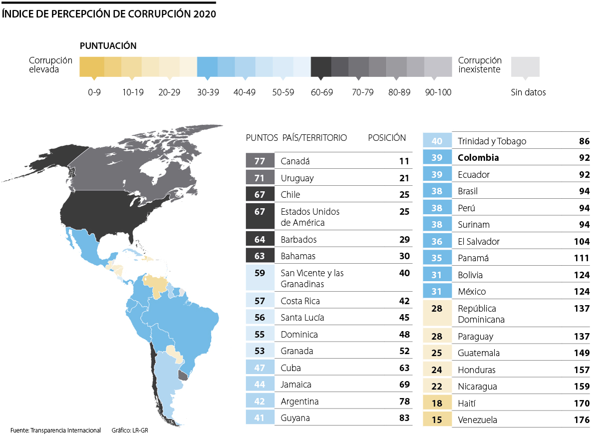 Mientras tanto, Colombia consiguió dos puntos más que el año pasado, sin embargo, estadísticamente esta variación no es considerada como un avance significativo. Por lo tanto, persiste el estancamiento en la calificación, pues desde el 2012 el país ha estado entre los 36 y los 39 puntos. Una calificación por debajo de 50 puntos indica niveles de corrupción muy serios en el sector público de un país.