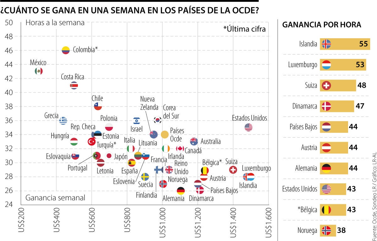 Al cruzar cifras de la Organización para la Cooperación y el Desarrollo Económicos (Ocde) de las ganancias anuales estimadas con las de horas anuales trabajadas y obtener el cálculo semanal, se ve, por ejemplo, que pese a que Colombia es el país que más trabaja, no es el que más gana.