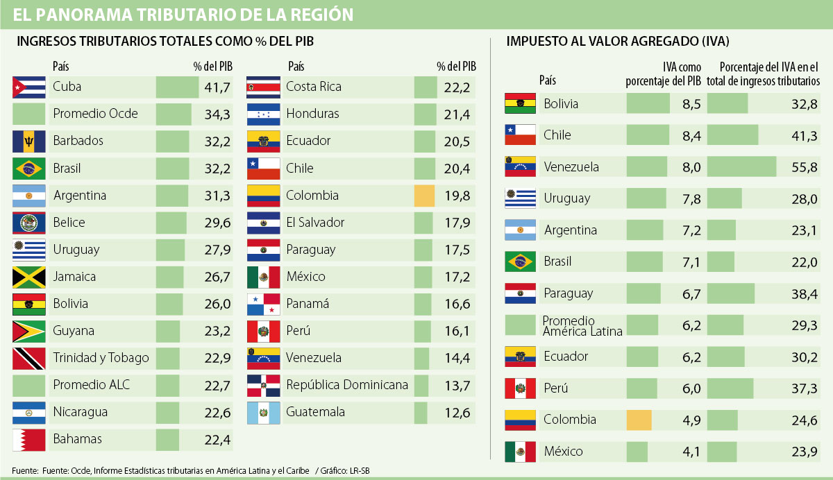 La Ocde, resalta que entre 1990 y 2016, los ingresos tributarios como proporción del PIB en Latinoamérica aumentó casi continuamente de 16% a 22,7%, siendo el IVA y los impuestos sobre la renta y utilidades los principales contribuyentes. No es el caso de Colombia, pues es el segundo país con menor porcentaje del IVA en relación al PIB con 4,9%, detrás de México con 4,1%. Además, es el cuarto país en el que el IVA aporta menor porcentaje al total del recaudo tributario con 24,6%. Los otros tres son Brasil (22%), Argentina (23,1) y México (23,9%).