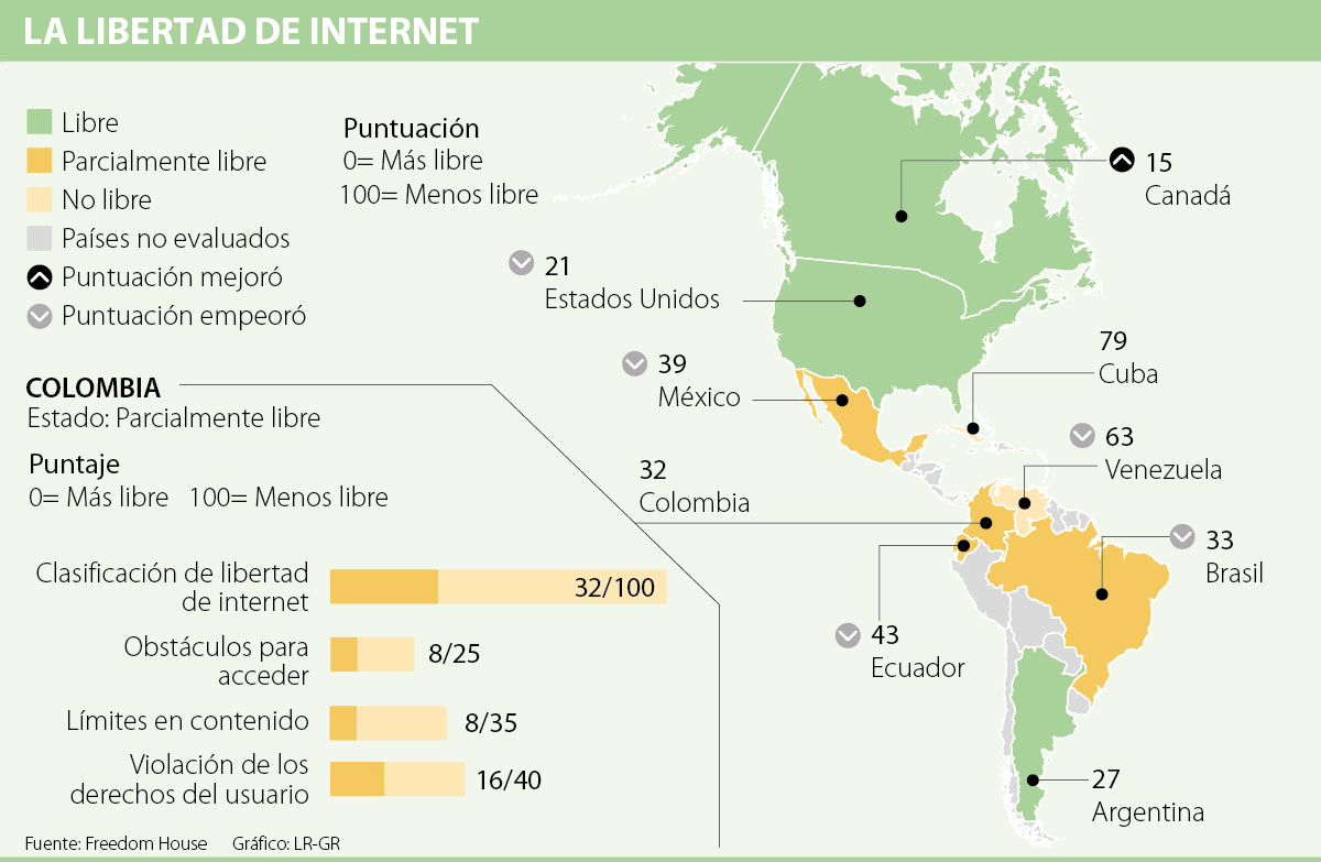De los nueve países de América evaluados, Colombia ocupa el cuarto lugar y es clasificado como parcialmente libre, ya que obtuvo una puntuación de 32 sobre 100, en una escala en la que entre más cerca se está de 0, más libertad hay y entre más cerca se está de 100, menos libertad hay.