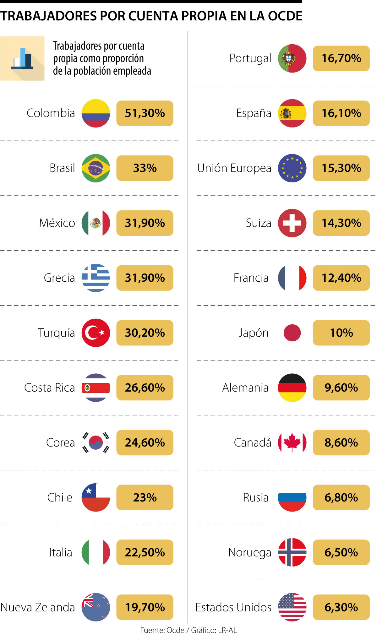 Después de Colombia, siguen: Brasil, con 33%; México, con 31,9%; Costa Rica con 26,6%; y Chile, que fue el país de la región con la menor tasa, con 23% de trabajadores independientes o por su cuenta.