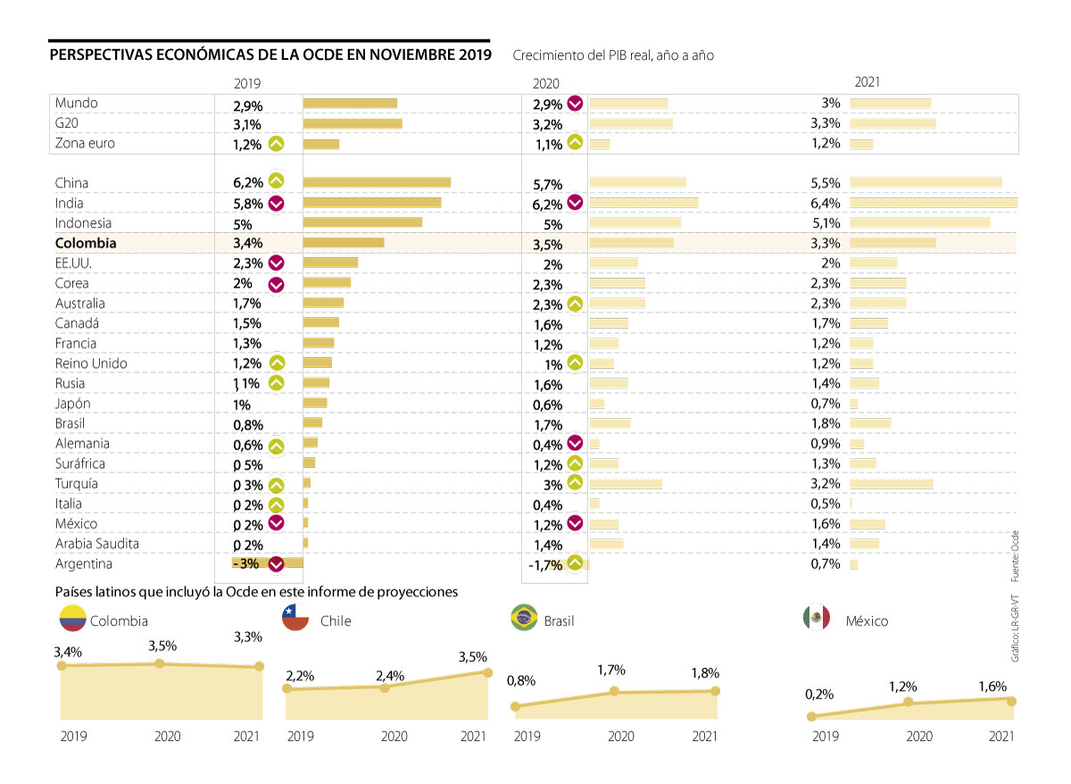 La Ocde resaltó que la tasa de desempleo que hoy se ubica en 10,2%, empezará a caer, así como que las bajas tasas de interés respaldarán el consumo. Entre los retos políticos que tiene Colombia, según la Ocde, está la alta tasa de desigualdad y la informalidad. Para 2020 prevén un crecimiento del PIB de 3,5%, mientras que para 2021 se ubicaría en 3,3%. Giraldo señaló que con la recesión mundial ya mencionada, “los precios de los commodities van a seguir bajando, por lo que las proyecciones caerían”.