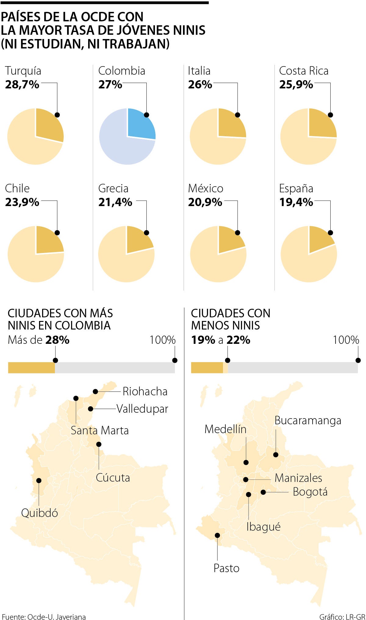 De acuerdo con el informe ´Panorama de la Educación 2022´ de la Ocde, Colombia ocupa el segundo lugar entre los países de la organización con la mayor tasa de jóvenes ninis con una cifra de 27,1%, superado sólo por Turquía, con 28,7%. El listado lo completan Italia, con 26%; Costa Rica, con 25,9%; Chile, con 23,9%; Grecia, con 21,4%; México, con 20,9% y España, con 19,4%.