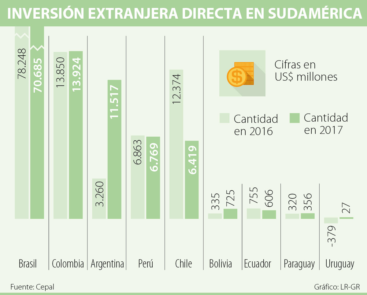 El caso más destacado de la región es el de Uruguay, pues en 2016 se encontraba en números negativos al percibir -US$379 millones de inversión extranjera directa, siendo el único país que se encontraba en dicha situación. Sin embargo, en 2017 llegó a US$27 millones, viendo un aumento de US$424 millones.