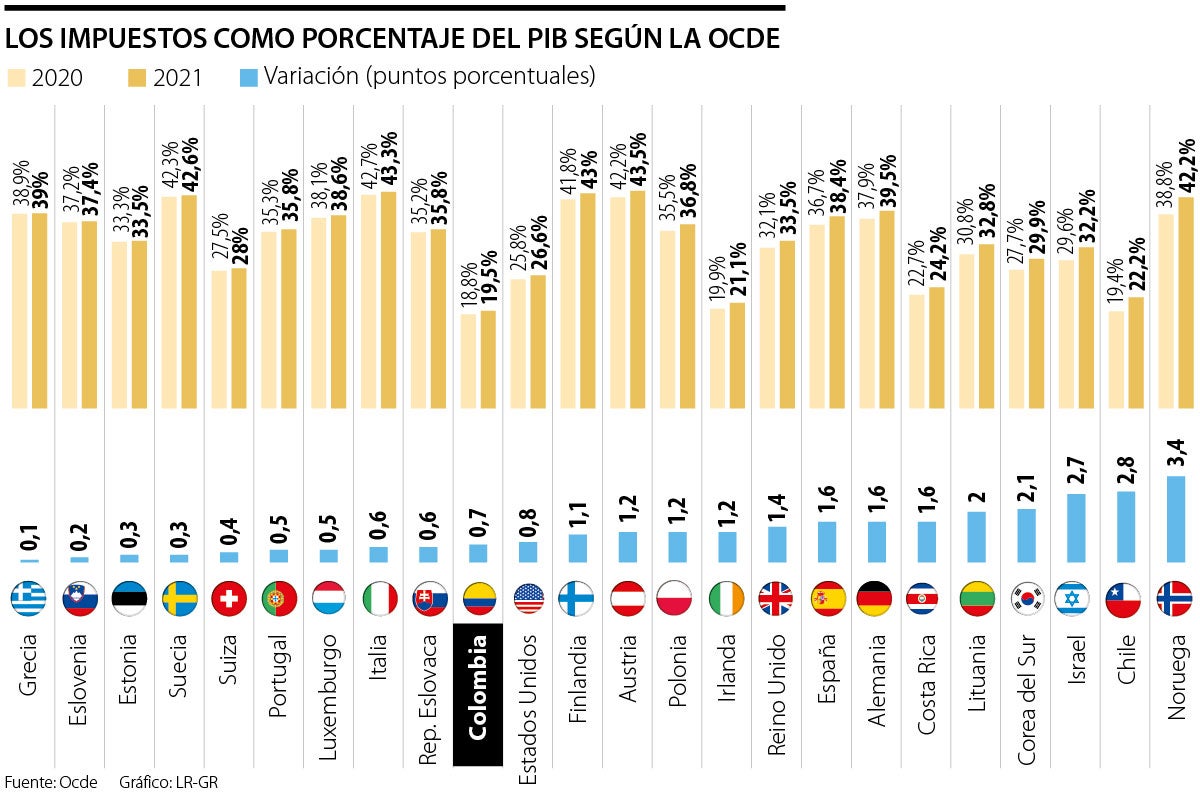 De acuerdo con el último informe de la Ocde, basado en cifras al cierre de 2021, Colombia es el segundo país que tiene la menor carga tributaria sobre el PIB, con 19,5%; antecedido por México, con 16,7%; el tercer lugar lo ocupa Irlanda, con 21,1%. Además, se encuentra entre las naciones que menos han aumentado dicha carga en los últimos dos años (ver gráfico).
