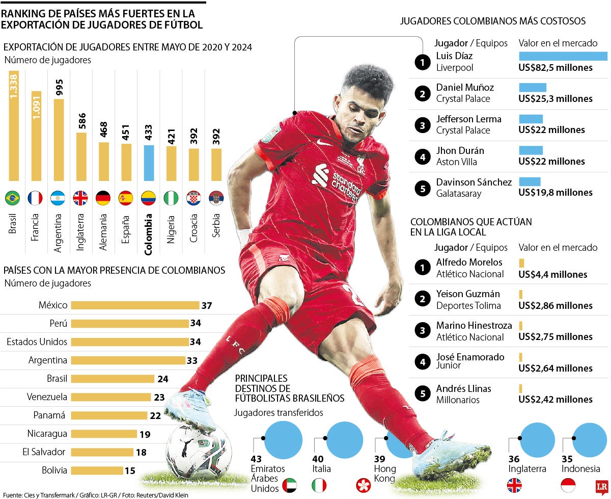 Las primeras conclusiones del reporte demuestran que Brasil fue el país que más exportó jugadores a mercados internacionales con 1.338 jugadores, Francia se llevó el segundo puesto con 1.091 futbolistas y Argentina se ubicó en la tercera casilla con 995 jugadores. Colombia fue el séptimo del mundo y tercero en América Latina con 433 traspasos, 19% más que hace cuatro años.