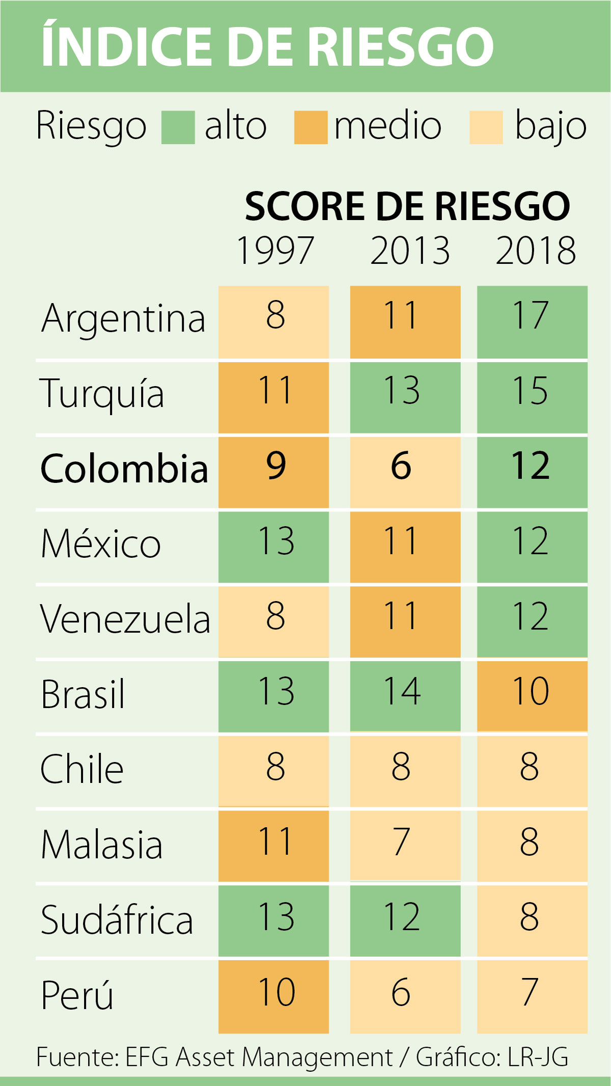 El grupo suizo EFG Bank señala a Colombia como el tercer mercado emergente con mayor riesgo de crisis frente a los choques externos; resultado del cruce entre indicadores como el déficit de cuenta corriente, el balance de presupuesto, su crecimiento de crédito, inflación y deuda externa entre otros.