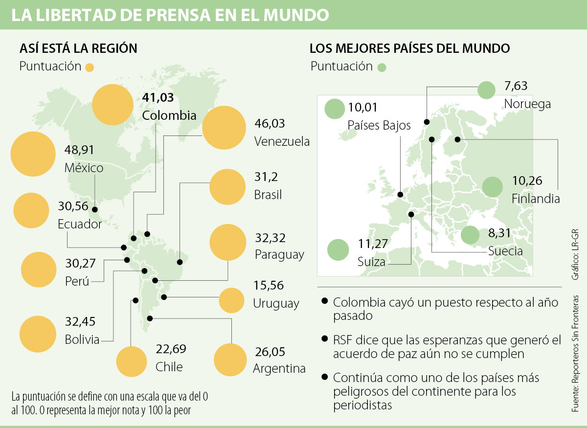 Sobre Colombia, que está en la posición 130 entre 180, el informe destaca que “sigue siendo uno de los países más peligrosos del continente para los periodistas; las agresiones y los secuestros siguen siendo frecuentes” y resalta la presión que ejercen las fuerzas armadas ilegales, como el ELN, que impide el ejercicio del periodismo en las zonas rurales. Los mejores países para la libertad de prensa son Noruega, Suecia y los Países Bajos. En la región, sobresalen Uruguay, Chile y Argentina.