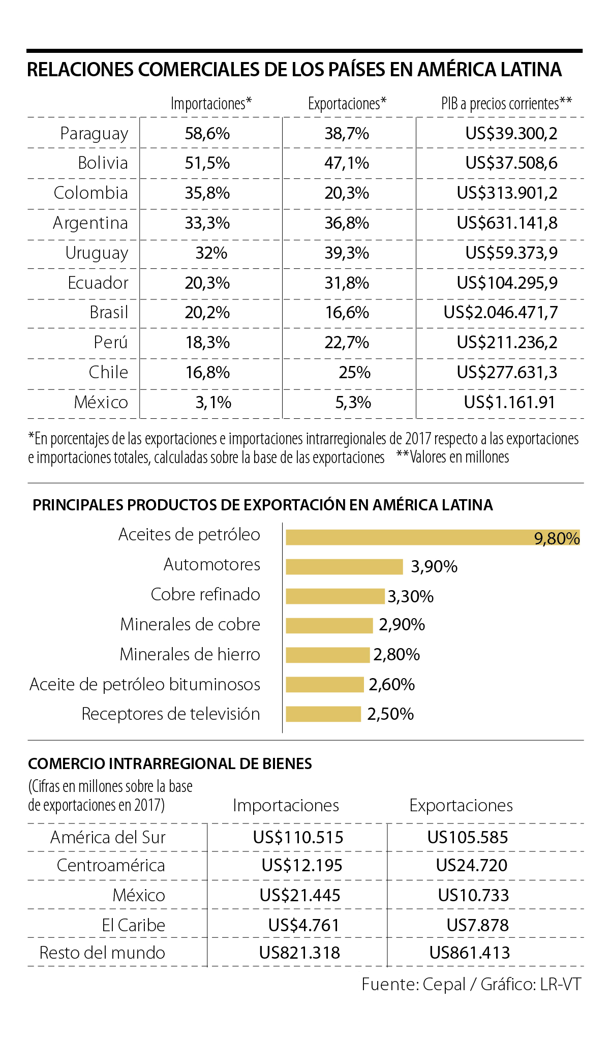 Las naciones con mayores exportaciones intrarregionales fueron Paraguay y Bolivia, que enviaron 58,6% y 51,1% de sus productos respectivamente.