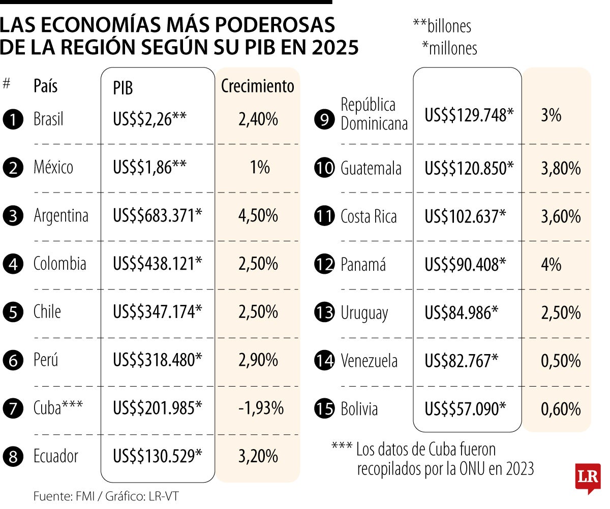 Colombia ocupó el cuarto lugar a nivel regional en el ranking de PIB nominal para 2025 según el FMI, después de Brasil, México y Argentina. Los dos primeros son los únicos de la región que lograron superar el US$1 billón en este indicador y se acercaron a otras economías avanzadas en el mundo como Canadá, Corea del Sur y España.