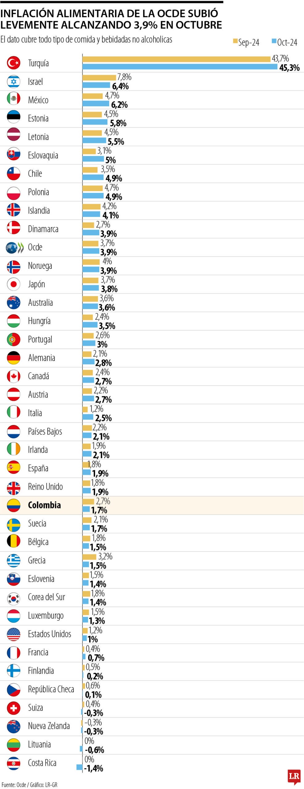 En las cifras de los 38 países de la organización, se destacó la inflación alimentaria de Colombia, pues esta se ubicó en 1,7%, reduciendo un punto porcentual frente a septiembre, cuando estaba en 2,7%.