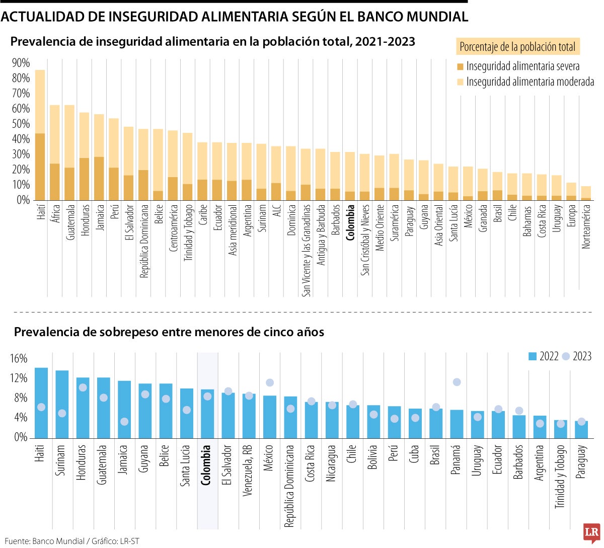 Poniendo la lupa en Colombia, el Banco Mundial resaltó que, si bien Colombia está en el cuarto lugar (por delante están Perú, Ecuador y Argentina) del listado en Suramérica, cuatro de cada 10 personas están en riesgo de no tener alimentos (inseguridad alimentaria).
