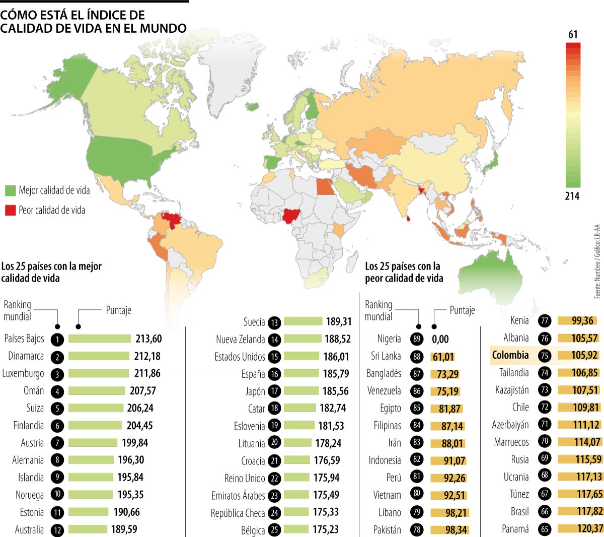 El más reciente Índice de Calidad de Vida 2026 elaborado por Numbeo ofrece una radiografía comparativa. Entre 89 países evaluados, Colombia ocupa el puesto 75, con un puntaje de 105,92. Esto la ubica dentro del grupo de las 15 naciones con peor calidad de vida del ranking global. La posición no responde a un único factor, sino a una combinación de variables económicas, sociales, ambientales y de infraestructura que, en conjunto, determinan el bienestar cotidiano de las personas.