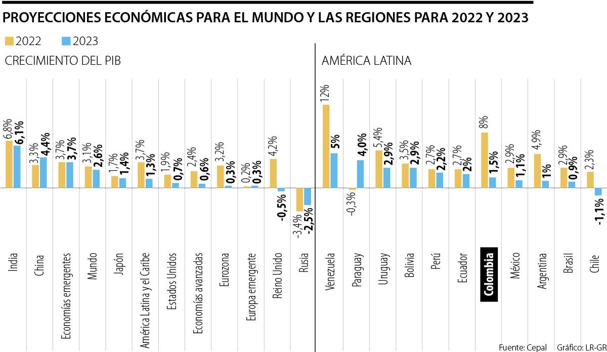 Sin embargo, la dinámica económica en 2023 se ralentizará fuertemente y Colombia está entre las naciones que menos se expandirán con una proyección de solo 1,5%, evidenciando un retroceso de 6,5 puntos porcentuales, si se compara con 2022. América Latina y el Caribe aumentaría su economía solo 1,3% en ese mismo periodo.