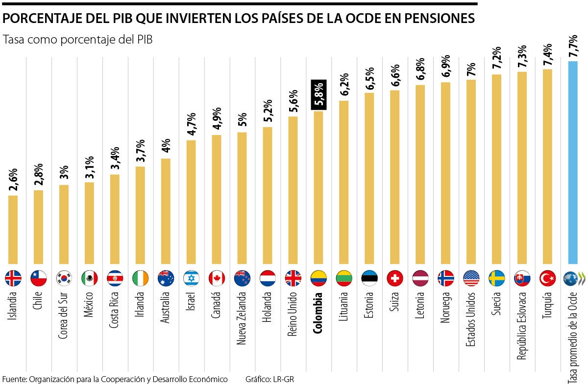 Dicho modelo de jubilación suele recibir recursos del erario público para subsidiar una porción de la jubilación o para mantener el funcionamiento del sistema. Sin embargo, cifras recopiladas por la Organización para la Cooperación y el Desarrollo Económico (Ocde) evidencian que Colombia se encuentra entre los países que destinan un menor porcentaje del PIB a este rubro, situándose, incluso, por debajo del promedio del llamado “club de las buenas prácticas”.