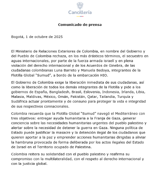 Además, Colombia hizo un llamado a los demás países cuyos nacionales se encuentran retenidos para actuar conjuntamente en defensa de la vida e integridad de sus ciudadanos y, reafirmó su solidaridad con el pueblo palestino y su compromiso con la justicia global, el respeto al derecho internacional y la defensa de la multilateralidad.