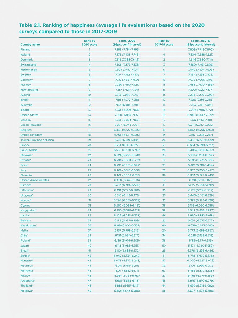 El noveno informe mundial sobre felicidad de World Happiness Report de la ONU fue en muchas maneras atípico producto del covid-19 en el mundo. El reporte afirmó que el reporte incluye evaluaciones de la vida en general, emociones positivas y negativas; además se utilizaron respuestas a nivel individual para investigar las afectaciones por el covid-19.