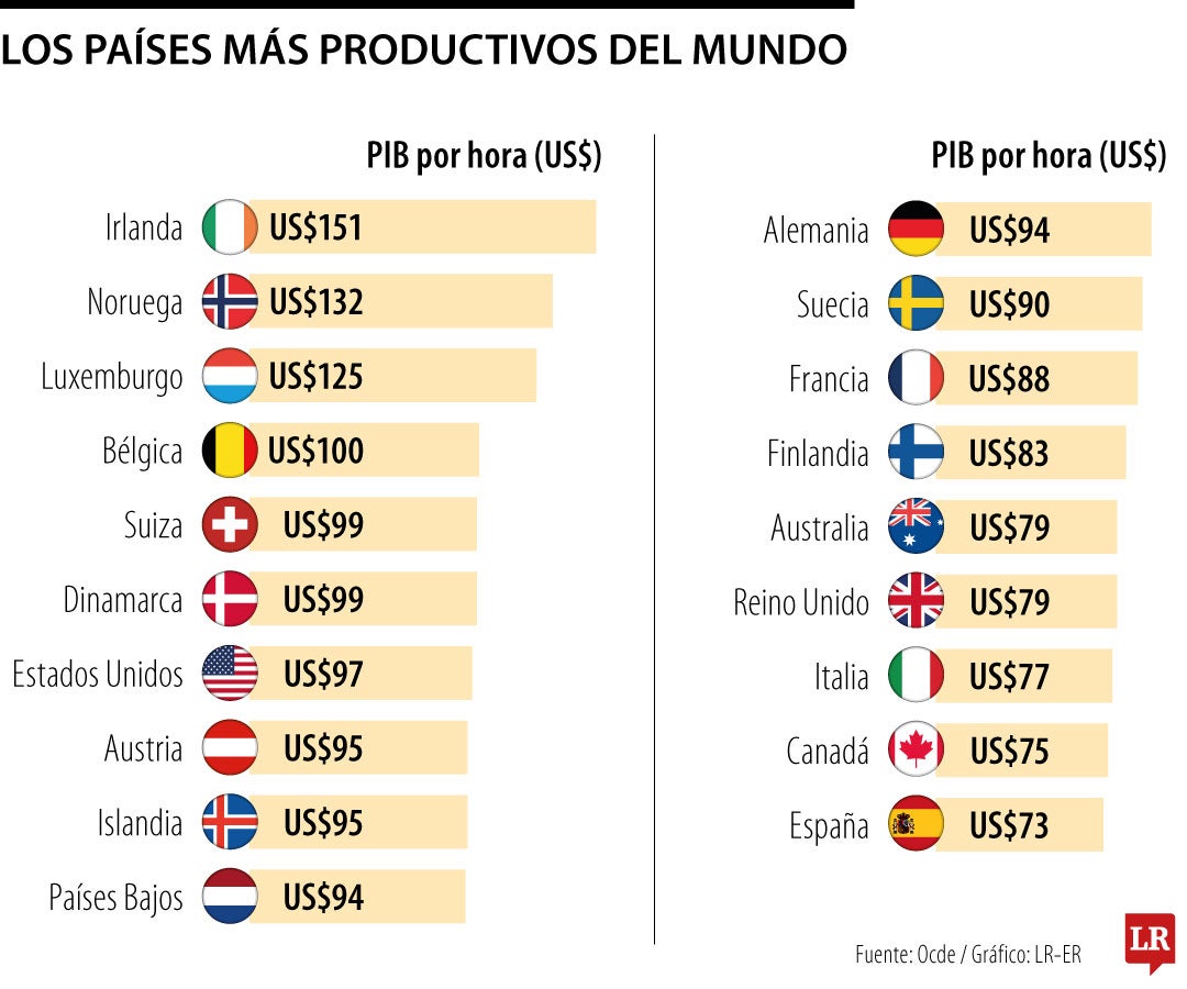 El ranking global muestra una fuerte concentración de productividad en economías europeas avanzadas y países altamente especializados. En el primer lugar se encuentra Irlanda, con un nivel de US$151 por hora trabajada, seguida por Noruega con US$132 y Luxemburgo con US$125. Más atrás aparecen Bélgica (US$100), Suiza y Dinamarca (ambos con US$99), y EE.UU. con US$97, todos por encima del promedio Ocde.